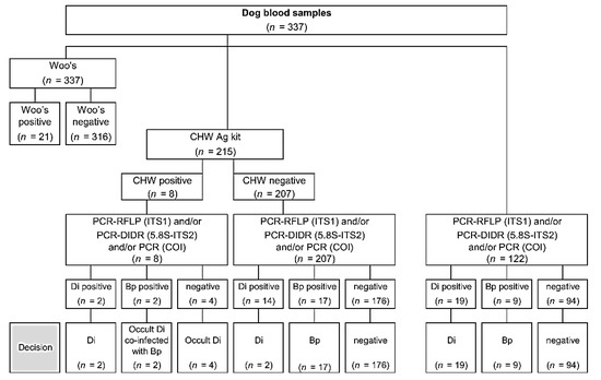 Diagnostic diagram of canine filariasis using CHW Ag test kit and three molecular techniques: PCR-RFLP of ITS1 region, PCR of 5.8S-ITS2-28S region, and PCR of cox1 gene. Di: D. immitis; Bp: Brugia pahangi.
