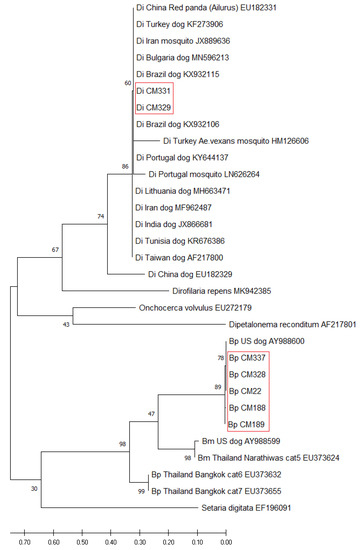 The obtained sequences were compared with the previously deposited ones in GenBank using the BLASTn program [23] for specific diagnosis. Seven successful 5.8S-ITS2 nucleotide sequences originating from two D. immitis isolates (Di CM329 and CM331) and five isolates of B. pahangi (Bp-CM22, CM188, CM189, CM328, and CM337) (Table S1) were used to analyze the phylogenetic relationship among the regions. In addition, the available sequences of D. immitis and B. pahangi from other countries (Brazil, Bulgaria, China, India, Iran, Lithuania, Portugal, Taiwan, Thailand, Turkey, Tunisia, and the U.S.; Table S1) were compared with the sequences obtained in this study for the construction of a phylogenetic tree. The sequences of B. malayi, Onchocerca volvulus, A. reconditum (previously Dipetalonema reconditum) and D. repens (GenBank accession: EU373624, EU272179, AF217801, and MK942385, respectively), and the sequence of Setaria digitata (EF196091) as the outgroup were included for evolution analysis. All sequences obtained in this study were submitted to the DDBJ/EMBL/GenBank database (Table S1).