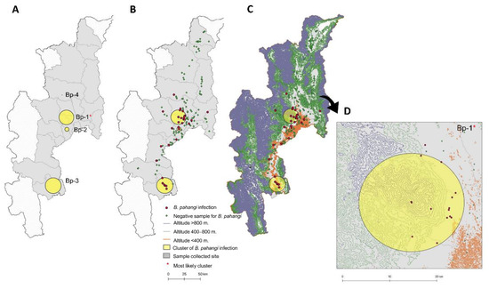 Geographic spatial clusters of B. pahangi infection obtained using the Bernoulli scan statistic model. (A). The distribution of four clusters of B. pahangi infection; (B). the distribution of B. pahangi cases in each cluster; (C). the altitudinal distribution of B. pahangi cases in each cluster; (D). the distribution of B. pahangi cases in the most likely cluster.