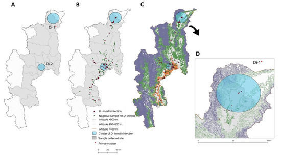 The canine filariasis spatial clusters were analyzed using the Bernoulli special scanning statistic method.Tthe relative risk (RR) and size of each cluster are outlined in Table 4. Four and two spatial clusters were identified for B. pahangi and D. immitis, respectively. Regarding B. pahangi distribution, a significant cluster (cluster Bp-1; p < 0.001) was identified with RR at 6.69 and a clustering radius of 10.55 km. This most likely cluster was distributed in three districts: Hang Dong, Mae Rim, and Mueang. The primary cluster of B. pahangi infection was found to occur in various altitudinal areas (0 to >800 m Figure 4C,D). Replacement of forests by agricultural activities and irrigated crops occurred in scattered locations in this cluster area. However, no significant spatial patterns were identified for D. immitis infection (Table 4), although the number of cases observed was higher than with B. pahangi. The most likely cluster of D. immitis infection (Di-1) was located in the Fang district (18.737609° N, 98.931619° E) where the clustering radius was 9.32 km, and the RR was 4.03. Sites of positive identification of D. immitis in this cluster were distributed in the low areas at altitudes of 400 to 800 m (Figure 5C,D) and were found mainly in areas with irrigated agricultural crops.