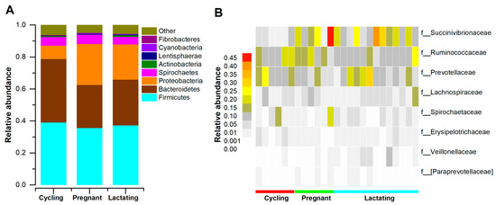 The distributions of main phyla and families in different reproductive states. (A): Relative abundance of gut microbial taxa at the phylum level. Stacked bar graphs illustrate the abundances of phyla, and x-axis represents the samples. (B): The distributions of families (the average relative of all fecal samples > 0.01). A heatmap was used to show family patterns.