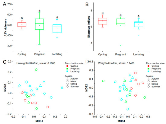 Differences in gut microbiome diversity of three reproductive states. (A): Comparison of ASV richness. (B): Comparison of Shannon diversity indexes. (C) and (D): Differentiation of gut microbiome structure. NMDS was used to show differentiation patterns of the three reproductive states. Adonis tests were performed on unweighted and weighted Unifrarc distance metrics. Significance level was 0.05.