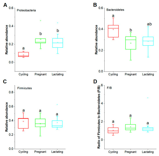 Furthermore, we found that the relative abundance of Proteobacteria was significantly lower in cycling state than in pregnant and lactating states (Cycling vs. Pregnant, p = 0.025; Cycling vs. Lactating, p = 0.025), whereas, there was no significant difference between pregnant and lactating states (p = 0.725) (Figure 3A). The relative abundance of Bacteroidetes was significantly higher in the cycling state than the pregnant state (Cycling vs Pregnant, p = 0.043; Cycling vs Lactating, p = 0.069), while there was no significant difference between pregnancy and lactation (p = 0.389) (Figure 3B). The relative abundance of Firmicutes, as well as the radio of Firmicutes to Bacteroidetes (F/B), did not differ significantly between any two reproductive states (p > 0.05) (Figure 3C,D).