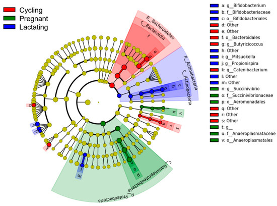 LEfSe analyses showed that each reproductive state was characterized by different bacterial taxa (from phylum to genus) (LDA > 2, p-value < 0.05) (Figure 4). Three known taxa were overrepresented in cycling samples, including o_Bacteroidales, g_Butyricicoccus and g_Catenibacterium. Five known taxa, including o_Anaeroplasmatales, f_Succinivibrionaceae, f_Anaeroplasmataceae, o_Aeromonadales, and g_Succinivibrio, were overrepresented in pregnant samples. We also found that six known taxa were overrepresented in lactating samples, which were o_Bifidobacteriales, f_Bifidobacteriaceae, g_Bifidobacterium, g_Mitsuokella, and g_Propionispira.