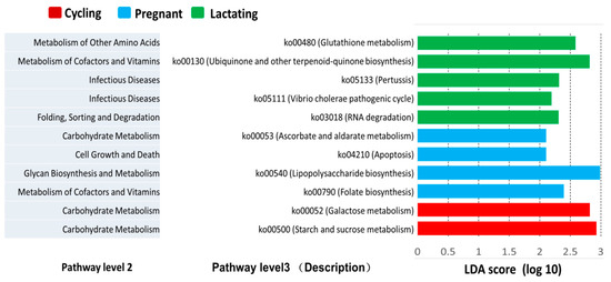 Furthermore, we also found several predicted metabolic functions (KEGG pathway level 3) were enriched in one of the three reproductive states based on LEfSe results (LDA > 2, p-value < 0.05) (Figure 5). The predicted functional genes of four KEGG pathways ko00790 (Folate biosynthesis), ko00540 (Lipopolysaccharide biosynthesis), ko00053 (Ascorbate and aldarate metabolism), and ko04210 (Apoptosis) were overrepresented in lactating individuals. Additionally, five KEGG pathways ko03018 (RNA degradation), ko05111 (Vibrio cholerae pathogenic cycle), ko05133 (Pertussis), ko00130 (Ubiquinone and other terpenoid-quinone biosynthesis) and ko00480 (Glutathione metabolism) were overrepresented in pregnant individuals. Moreover, two KEGG pathways ko00500 (Starch and sucrose metabolism) and ko00052 (Galactose metabolism) were overrepresented in cycling individuals.