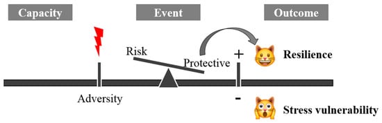 Essential to understanding the precise meaning of resilience is to introduce the concept of stress because the features of stressful events define if and when an animal will go back to a pre-crisis status. Stress is defined as any factor of different nature (physical, chemical, behavioral, social) that changes or threatens homeostasis, thereby eliciting specific response mechanisms. Two contrasting hypotheses have explained the impact of stress. The cumulative stress models claim that the build-up of stress across the life span or adversity never has any beneficial effect; instead, the risk of disease gradually increases []. The match/mismatch model, which explains the concept of stress/epigenetic changes, includes adaptation to early-life stressors (even significant cumulative stressors) for specific individuals, thus including the concept of resilience. Early-life exposure to stressors can bring about epigenetic changes to match an organism to its environment and decrease the risk of vulnerability. A mismatch between the phenotypic outcome of the epigenetic changes and the ability to cope with current environmental stressors increases the risk of vulnerability [].