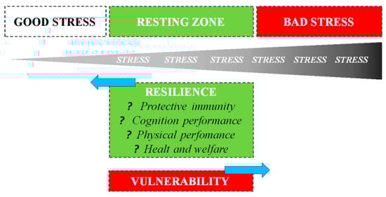 The theoretical and methodological papers collected in this section provide different perspectives to understand better some of the main mechanisms of stress and the following resilience or vulnerability implications. In mammals, the resilience system evolved as a stress-solving mechanism to enhance the survival of the animals. The resilience of the whole organism depends on the resilience of the subsystems regulating vital parameters and mood. More specifically, the continuous regulatory processes that balance stress between the subject and the environment result in a stable life development []. If systemic resilience decreases, the risks of morbidity and mortality increase. To best explore the interactions between environmental stressors and resilience, some potential stressful environmental sources, such as “sunlight, temperature, feeding, early-life conditions, social interactions [].