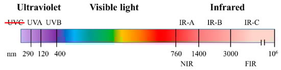 Solar radiation provides the Earth with light and heat; this radiant energy is necessary for the inhabitants of biological environments. The solar spectrum that reaches the surface of Earth consists of three bands: ultraviolet (UV), which makes up to 8% (290–400 nm); visible light (VL), up to 42.3% (390–700 nm); and infrared (IR), that reaches 49.4% (600–1000 nm), of the whole radiation. Each of these bands has a different impact on humans and animals (Figure 3).