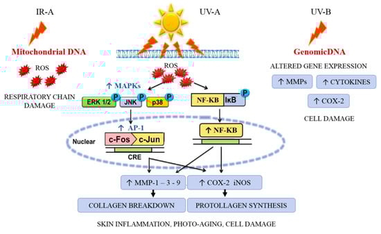 The infrared waveband is divided into three bands: IR-A (760–1400 nm), IR-B (1400–3000 nm), and IR-C (3000 nm–1 mm). IR radiation can penetrate the epidermis, dermis, and subcutaneous tissue to differing extents depending on the exact wavelength range being studied. Exposure to IR is perceived as heat. IR-A is mainly absorbed in mitochondria and impairs the respiratory chain, which also results in ROS generation. ROS intervenes by driving the activation of mitogen-activated protein kinase MAPK (i.e., ERK, JNK, and p38) through recruiting the transcription factor activator protein-1alias AP-1 (c-Fos and c-Jun) to the nucleus and subsequently activating NF-κB for upregulating the pro-inflammatory gene expression [,]. The increase of AP-1 expression upregulates the gene and protein expression of MMPs [] (especially MMP-1, MMP-3, and MMP-9) that degrade the ECM (e.g., collagen and elastin), causing coarse wrinkles and sagging skin, and characteristic inflammation signs (erythema) mediated by COX-2 and iNOS (Figure 4).