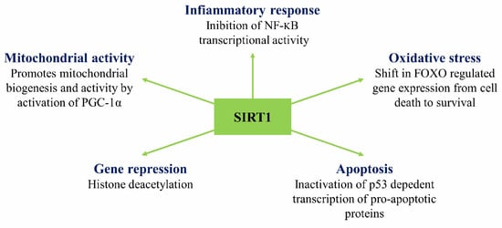 Sirtuin 1 (SIRT1), is considered anti-ageing protein modulating protective mitochondrial pathways against oxidative stress. Transgenic mice overexpressing SIRT1 display an enhanced mitochondrial activity, defending against oxidative stress, DNA damage, and apoptosis. Besides, caloric restriction enhances SIRT1 activity, resulting in decreased ROS, preserved mitochondrial function, and enhanced signaling pathway of insulin growth factor, contributing to prolonged lifespan and ischemic protection shown in many invertebrate and vertebrate species.