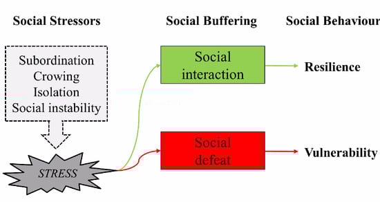 In their lifetime, animals perform many activities aimed at survival and reproduction; for example, they find food and mates, defend themselves and, in many cases, care for their offspring or other relatives. These activities become “social” when they involve interactions among members of the same species in a way that influences immediate or future behavior []. Social interactions between organisms living in a group can positively and negatively affect characteristics such as their well-being, productivity, health, and individual resilience. In rodents, humans, and non-human primates, social interaction or social defeat has been shown to curb genetic and environmental vulnerabilities and confer resilience to stressors, probably via its effects on the hypothalamic-pituitary-adrenocortical system, the noradrenergic system, and central oxytocin pathways [] (Figure 7).