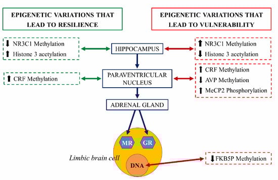 Schematic representation of the epigenetic regulation of the hypothalamus-hypophysis-adrenal axis (grey axis). The right side of the figure illustrates the epigenetic changes that lead to vulnerability to stress and risk at each structure (red arrow). The left side represents epigenetic variations that lead to resilience at each structure (green arrow). NR3C1: steroid receptor gene, pMeCP2: phosphorylated protein related to methylation of histones, CRF, corticotropin-releasing factor gene, AVP: arginine vasopressin gene, FKBP5: gene coding for chaperones for the expression of glucocorticoid receptors (GR) and mineralocorticoid receptors (MR) [].