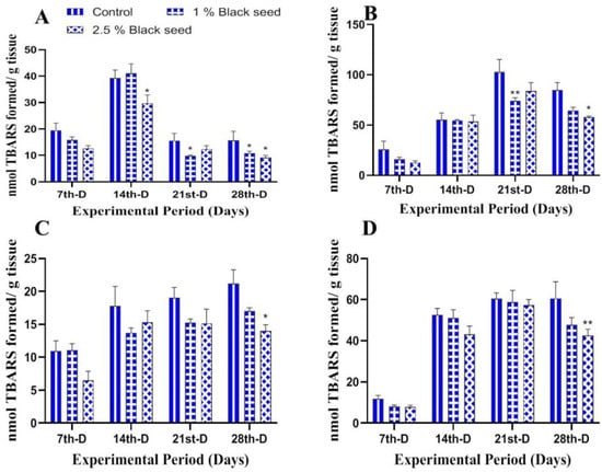 The effects of dietary black seed supplementation on the oxidative stress and antioxidant enzymes activities in all the studied tissues of rohu are shown in Figure 1, Figure 2, Figure 3, Figure 4 and Figure 5. The black seed supplemented rohu showed decreased lipid peroxidation levels in all the studied tissues (liver, kidney, gills and brain) when compared with un-supplemented ones (Figure 1A–D).