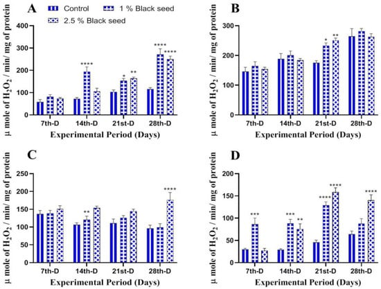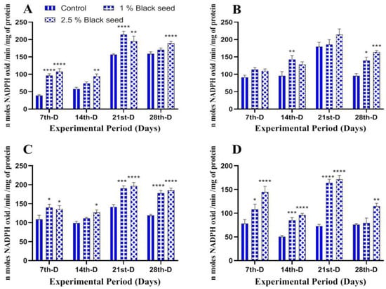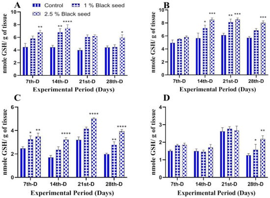 Furthermore, GSH levels were elevated in all the studied tissues of rohu fed with black seed supplemented diets in comparison with control (Figure 5A–D).