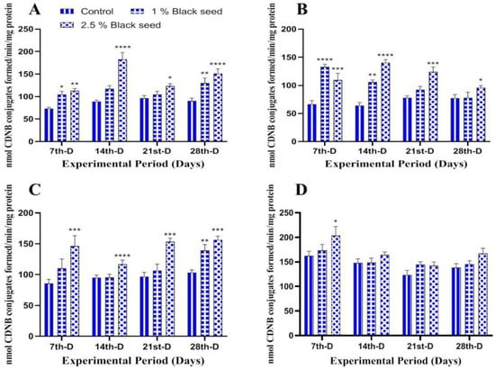 Glutathione-S-transferase activity in liver (A), kidney (B), gills (C) and brain (D) of rohu fed black seed supplemented diets for 28 days. Each value represent the mean ± S.E.M (n = 5). Columns with different asterisk are statistically different (* p < 0.05, ** p < 0.01, *** p < 0.001 and **** p < 0.0001).