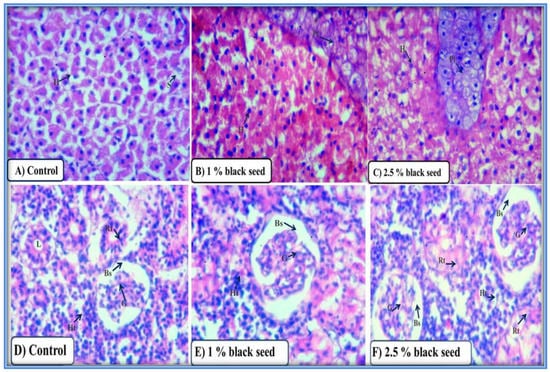 The histo-architecture of liver (hepatocytes, sinusoids and pancreatic tissue) and kidney (glomerulus, Bowman’s space, renal tubules and hematopoietic tissue) of rohu fed black seed supplemented diets was in similar with control group (Figure 6A–F).