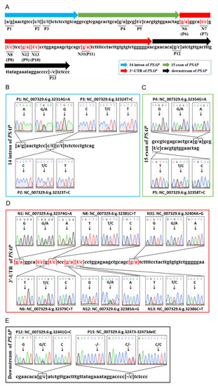 Sequencing of variants in bovine PSAP. (A) The genetic mapping of bovine PSAP by sequencing; (B) three single-nucleotide polymorphisms (SNPs) in the 14th intron of bovine PSAP; (C) two SNPs in the 15th exon of bovine PSAP; (D) five SNPs in bovine PSAP 3’ UTR; (E) two variants in the downstream region of bovine PSAP. P: the number variants in the fragment of PSAP; N: the number of bases in PSAP 3’ UTR.