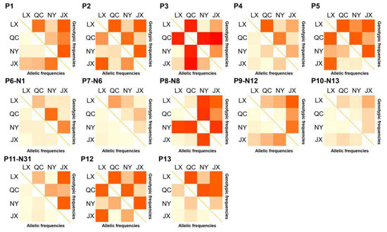 The population parameters of four cattle breeds were calculated, including genotype frequency, allele frequency, HWE, Ho, He, Ne, and PIC (Table 3 and Table 4). For the P3 locus, CC was the dominant genotype in LX, NY, and JX cattle, but TT was the dominant genotype in QC cattle (Table 3). Chi-square test (Figure 2) showed the difference in allele and genotype frequency between QC cattle and the other three breeds more clearly. In the P8 locus, TT was the dominant genotype in NY, while CC was the dominant genotype in the other three groups (Table 4). Figure 2 more clearly shows the difference in genotype and allele frequency between NY and the other three breeds at locus P8. Incidentally, for the N6 (P7) locus, the quantity of TT and TC genotypes were not enough for statistical calculation in the present study (Table 4). The rest of the genotype distribution of the 11 loci were the same in the four cattle breeds (Table 3 and Table 4). Linkage disequilibrium analysis showed that the linkage of 13 loci in QC, LX, and JX cattle was different from the NY cattle (Figure 3).