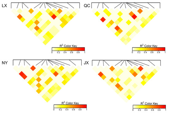 Linkage disequilibrium analysis (R2) of 13 variants in four cattle breeds. QC: Qinchuan cattle; NY: Nanyang cattle; JX: Jiaxian red cattle; LX: Luxi cattle.