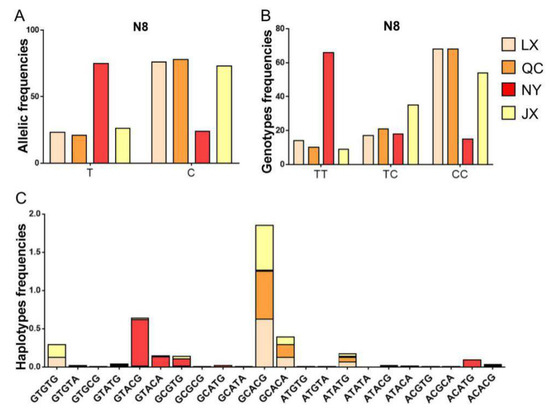 Allele, genotype, and haplotype distribution in four cattle breeds. (A) The allele frequency of the N8 locus of bovine PSAP in four cattle breeds; (B) the genotype frequency of the N8 locus of bovine PSAP in four cattle breeds; (C) the haplotype frequency of five SNPs of bovine PSAP 3’ UTR in four cattle breeds. QC: Qinchuan cattle; NY: Nanyang cattle; JX: Jiaxian red cattle; LX: Luxi cattle.