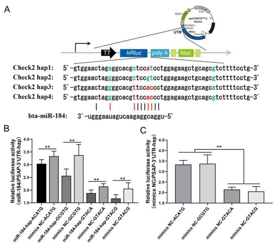 Targeting of bta-miR-184 and four haplotypes of bovine PSAP 3’ UTR. (A) Four haplotypes and their targeting of bta-miR184 (red represents mismatch and green represents match); (B) relative luciferase activity of four haplotypes and bta-miR-184; (C) relative luciferase activity of two haplotype groups. ** p < 0.01.