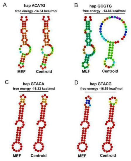 mRNA secondary structure prediction of four haplotypes in PSAP 3’ UTR: (A) ACATG; (B) GCGTG; (C) GTACA; (D) GTACG.