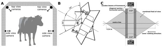 (A): Schematic representation of the framework with the positions and lines of sight of the side view and top view Kinect cameras shown as black bullets and arrows. (B): Technical drawing of a pair of top view Kinect cameras, fixed with 56° angle between the fronts. In the foreground, the bottom of a Kinect base is seen as pointing away from the pair. (C): Combined horizontal field of view of all four top view cameras.