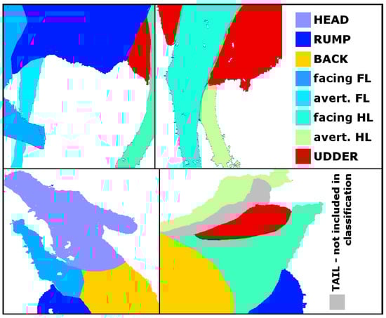 The helper tool ‘Polygon drawer’ was self-developed in MATLAB and used to generate a training data set. Overall, 100 depth maps for each camera were randomly selected, i.e., 200 depth maps for each camera position (‘U’, ‘N’, ‘S’). One person manually labelled the body parts head, rump, back, the foreleg facing the camera, the foreleg avert from the camera, the hindleg facing the camera, the hindleg avert from the camera and the udder by mouse-clicking polygons around them (Figure 2). Hereby, the body part ‘udder’ was excluded with regard to camera position ’U’, as udders were not seen from this camera position. Thus, in the aspired multiclass classification, these eight, respectively, seven body parts were used as responses.