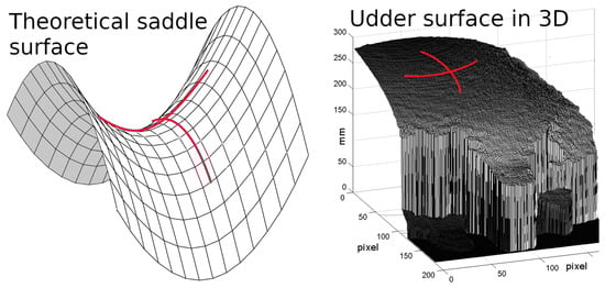 Exemplary visualisation of principal curvatures (red) in a point on a theoretical saddle surface (left) and the surface of an udder as measured by the Kinect (right). The mean curvature is the average of the principal curvatures, but can also be calculated from the gradient and the Hessian matrix in the respective surface point (Equation (1)).