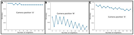 Accuracy depending on the number of neighbours in training a kNN classifier for camera positions ‘U’ (figure part A), ‘N’ (figure part B) and ‘S’ (figure part C). The hyperparameter k was tuned via grid search with five fold cross-validation.