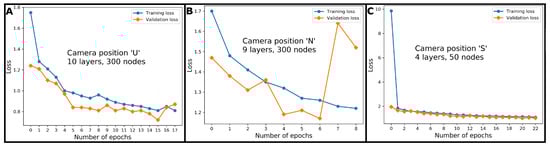 The smallest validation loss with regard to camera position ‘U’ was observed for the neural network, with ten hidden layers and 300 nodes per hidden layer. For camera position ‘N’, a neural network with nine hidden layers and 300 nodes per hidden layer was chosen. Regarding camera position ‘S’, the validation loss reached its minimum for a neural network with four hidden layers and fifty nodes per hidden layer. Figure 5 presents the training curves for all three camera positions.