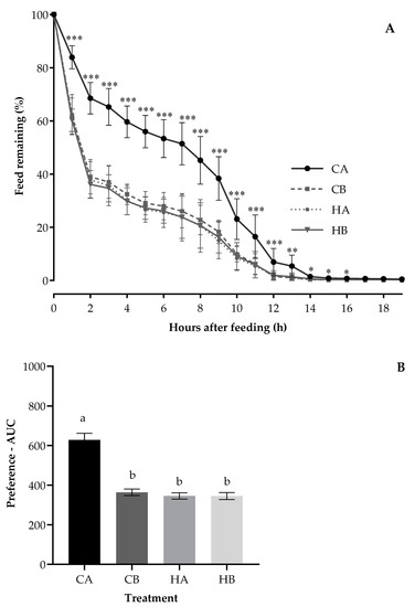 The pattern of hourly feed remaining (A) and preference—AUC (B) for calves fed the Control pellets stored at ambient temperature (CA) or 5 °C (Control/Chiller (CB)) and H57 inoculated pellets stored at ambient temperature (HA) or 5 °C (H57/ Chiller (HB)). a,b Value bars in the subfigure (B) with the different letters are statistically different at p < 0.0001; Asterisks indicate significant differences at * p < 0.05, ** p < 0.01, ***p < 0.001; error bars represent the SEM.