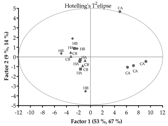 Pattern of relationships between the Control pellets stored at ambient temperature (CA) or 5 °C (CB) and H57 inoculated pellets stored at ambient temperature (HA) or 5 °C (HB) in a score plot of the PLSR analysis. Hotelling’s T2 ellipse indicated the outlier with critical test value at α = 0.05.