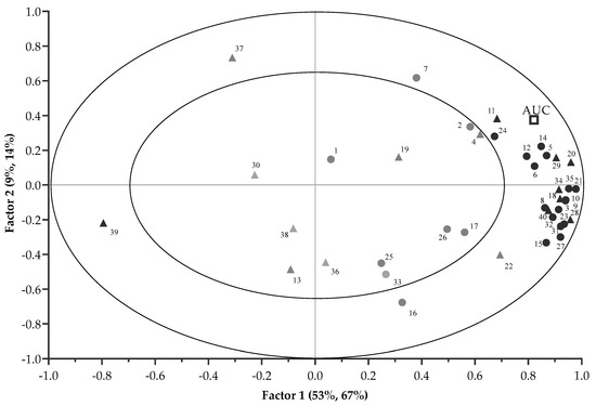 Correlation loading plot of the PLSR analysis with the 16 important mVOCs and 8 non-mVOCs (in bold) contributing to variance of preference-AUC (● mVOCs; ▲ non-mVOCs). The numbers correspond to compound names as in Table 2. The outer ellipse indicates 100% explained variance. The inner ellipse indicates 50% of explained variance.