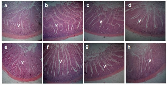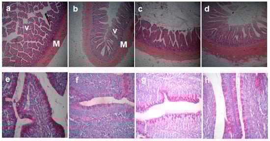 A representative photomicrograph of 40× magnification H&E stained small intestine sections of the broiler chickens. (a–d) Duodenal sections from control group, GML1, GML3, and GML5 groups, respectively, showing increase in villus (V) length in GML1, GML3 groups and decrease in the GML5 group. (e–h) Jejunal sections from the control group, GML1, GML3, and GML5 groups, respectively, showing increase in villus (V) length in the GML1 group compared to the control group.