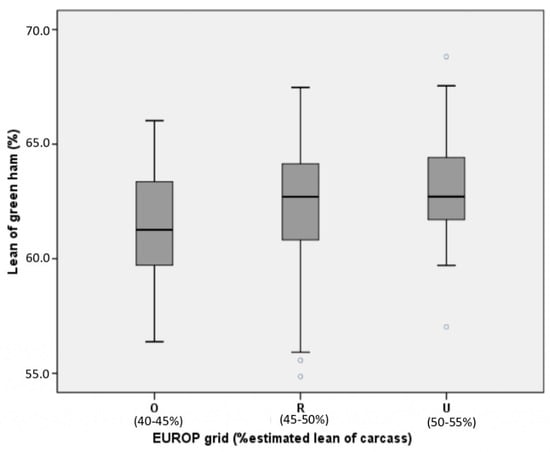Boxplots of the lean content (%) estimated by Ham InspectorTM for the green hams grouped according to the EUROP classes (U, R, and O) of the corresponding carcasses. For each EUROP class, the range of % estimated lean carcass is reported. Blank circles represent outliers.