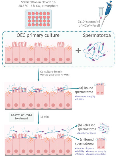 The OEC/sperm co-cultures were washed three times with NCWM to remove unbound sperm. Then, were incubated with CWM or NCWM (control) for 15 min and washed again three times with NCWM to recover released sperm (Figure 1b) and the population that remained bound to the OECs (Figure 1c). The following analyses were performed in the released sperm population retrieved: the number of sperm, viability, acrosome integrity, motility and capacitation status. Additionally, we evaluated the number of sperm bound to the OECs. A replicate (n) in these experiments was defined as the co-culture of an OEC monolayer co-cultured with sperm from one stallion (total 4 stallions). All the treatments (including the control) were performed for each replicate.