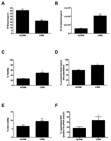 As Figure 5A,B shows, the treatment with CWM reduced the number of OEC-bound spermatozoa (p < 0.05) concurrently increasing the number of released ones (p < 0.05). The released sperm in response to CWM treatment also showed a significantly higher percentage of alive spermatozoa (p < 0.05) with intact acrosomes (p < 0.05) and total motility (p < 0.05) (Figure 5C–E). In contrast, this effect on motility was not observed during the incubation of cryopreserved spermatozoa at the same conditions (7 × 106 sperm/mL, 60 min) in OECs’ absence where total motility was around 0% (subjectively evaluated using a field microscope, data not shown). Moreover, spermatozoa released in response to CWM showed an increase in PKA activity and protein tyrosine phosphorylation (pY) (p < 0.05) (Figure 5F).