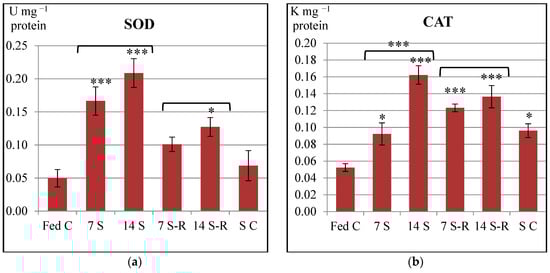 Specific activities of antioxidant enzymes in the intestine of Acipenser stellatus juveniles subjected to different starvation/refeeding regimes. (a) Superoxide dismutase (SOD) specific activity; (b) catalase (CAT) specific activity. The data are illustrated as average value of the groups (n = 8) ± standard error of the mean (SEM). All data were statistically analyzed using one way—ANOVA. Statistical significance: * p < 0.05; *** p < 0.001; the statistical significance of the changes is related to the fed control level and it is also presented between 7 S and 14 S groups and between 7 S-R and 14 S-R groups. Fed C—fed control group; 7 S—group starved for 7 days; 14 S—group starved for 14 days; 7 S-R—group starved for 7 days and refed 21 days; 14 S-R—group starved for 14 days and refed 21 days; S C—starved control.