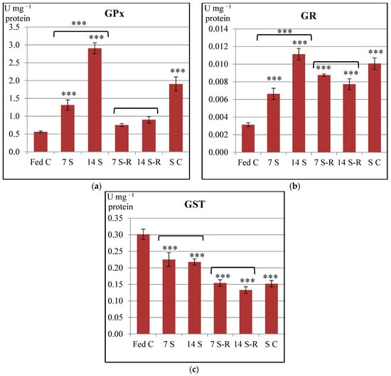 Specific activities of antioxidant enzymes in the intestine of Acipenser stellatus juveniles subjected to different starvation/refeeding regimes. (a) Glutathione peroxidase (GPx) specific activity; (b) glutathione reductase (GR) specific activity; (c) glutathione S-transferase specific activity. The data are illustrated as average value of the groups (n = 8) ± standard error of the mean (SEM). All data were statistically analyzed using one way—ANOVA. Statistical significance: *** p < 0.001; the statistical significance of the changes is related to the fed control level and it is also presented between 7 S and 14 S groups and between 7 S-R and 14 S-R groups. Fed C—fed control group; 7 S—group starved for 7 days; 14 S—group starved for 14 days; 7 S-R—group starved for 7 days and refed 21 days; 14 S-R—group starved for 14 days and refed 21 days; S C—starved control.