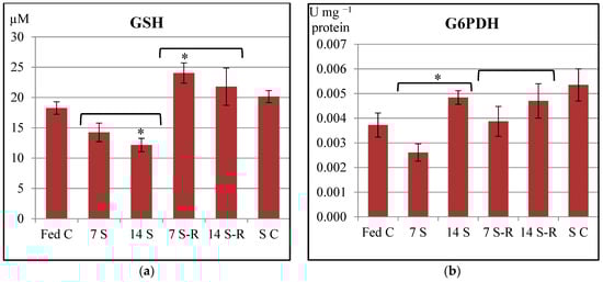 The level of other biomarkers involved in antioxidant defense mechanisms in the intestine of Acipenser stellatus juveniles subjected to different starvation/refeeding regimes. (a) The level of GSH; (b) glucose 6-phosphate dehydrogenase (G6PDH) specific activity. The data are illustrated as average value of the groups (n = 8) ± standard error of the mean (SEM). All data were statistically analyzed using one way—ANOVA. Statistical significance: * p < 0.05; the statistical significance of the changes is related to the fed control level and it is also presented between 7 S and 14 S groups and between 7 S-R and 14 S-R groups. Fed C—fed control group; 7 S—group starved for 7 days; 14 S—group starved for 14 days; 7 S-R—group starved for 7 days and refed 21 days; 14 S-R—group starved for 14 days and refed 21 days; S C—starved control.