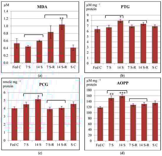 The level of oxidative stress biomarkers in the intestine of Acipenser stellatus juveniles subjected to different starvation/refeeding regimes. Lipid peroxidation biomarkers: (a) level of malondialdehyde (MDA). Protein oxidation biomarkers: (b) concentration of protein thiol groups (PTG). (c) The concentration of protein carbonyl groups (PCG). (d) The concentration of advanced oxidation protein products (AOPP). The data are illustrated as average value of the groups (n = 8) ± standard error of the mean (SEM). All data were statistically analyzed using one way—ANOVA. Statistical significance: * p < 0.05; ** p < 0.01; *** p < 0.001; the statistical significance of the changes is related to the fed control level and it is also presented between 7 S and 14 S groups and between 7 S-R and 14 S-R groups. Fed C—fed control group; 7 S—group starved for 7 days; 14 S—group starved for 14 days; 7 S-R—group starved for 7 days and refed 21 days; 14 S-R—group starved for 14 days and refed 21 days; S C—starved control.