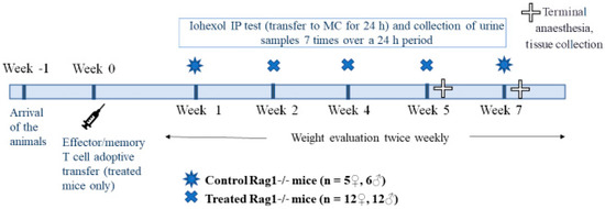 The following are available online at https://www.mdpi.com/2076-2615/11/1/79/s1, Figure S1: Effects of T cell injection and metabolic cage housing on body weight in mice; Figure S2: Percentile plots of the median ± IQR number of mice delivering urine during the intestinal permeability test after the oral administration of iohexol; Figure S3: Profile of the median ± IQR volume of mouse urine collected at seven time points during a 24 h period from control and treated mice after the oral administration of iohexol; Table S1: Number of mice delivering urine, and the median ± IQR volume of mouse urine, during a total of 8 IP tests at seven time points over a 24 h period in control and treated mice after the oral administration iohexol; Table S2: Urinary excretion of iohexol (%) in control and treated groups during a 24 h period after the oral administration of iohexol; Table S3: Urinary excretion of iohexol (%) in female and male control and treated mice measured seven times over a 24 h period after the oral administration of iohexol; Table S4: Urinary excretion of iohexol (%) in 24 treated mice measured seven times over a 24 h period after the oral administration of iohexol; Table S5: Correlation coefficients between the urinary excretion of iohexol in female and male mice at the cumulative 24 h time point and both the seven individual and the cumulative urinary collection samples, collected during 24 h after the oral administration of iohexol to control and treated mice; Table S6: Scoring system used for the assessment of histological duodenitis in well-oriented sections stained for Ki-67 (immunohistochemistry) or H/E, at sites of maximal damage; Table S7: Spearman’s rank correlation between the histological score for duodenitis, duodenum weight and small intestinal weight in control and treated mice; Table S8: Spearman’s rank correlation between the histological score for duodenitis and the ratio duodenum weight/body weight, and small intestinal weight/body weight in control and treated mice; Table S9: Spearman’s rank correlation between the urinary excretion of iohexol and the histological score for duodenitis, duodenum weight and total small intestinal weight in treated mice.