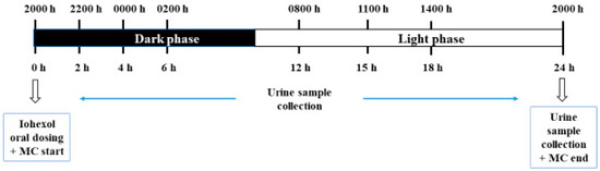The iohexol IP test consisted of a single dose of iohexol (10 mL/kg, 647.1 mg/mL, Omnipaque 300®, Amersham Health, The Netherlands) administered by orogastric gavage to each mouse using a malleable stainless steel feeding needle and a 1 mL syringe [23]. The recommended iohexol dosage for the assessment of intestinal permeability in mice was adjusted from Frias et al. [1]. After iohexol dosing, the animals were placed in individual MCs for urine collection for 24 h. Urine samples were taken seven times over 24 h (at 2, 4, 6, 12, 15, 18 and 24 h), starting when the lights turned off in the animal room (Figure 2). This moment is the beginning of the active phase of the circadian rhythm of the mice [39,40,41]. During this phase, a dim red light was used to maintain the circadian organization and to avoid any circadian disturbance in the animals during the experiment [42,43,44]. No sedative drug was used before, during or after iohexol administration. Animals were randomly oral-dosed and allocated to each MC by using a list randomizer program (https://www.random.org/lists/). Three food pellets and bottles of fresh tap water were provided before using the MCs.