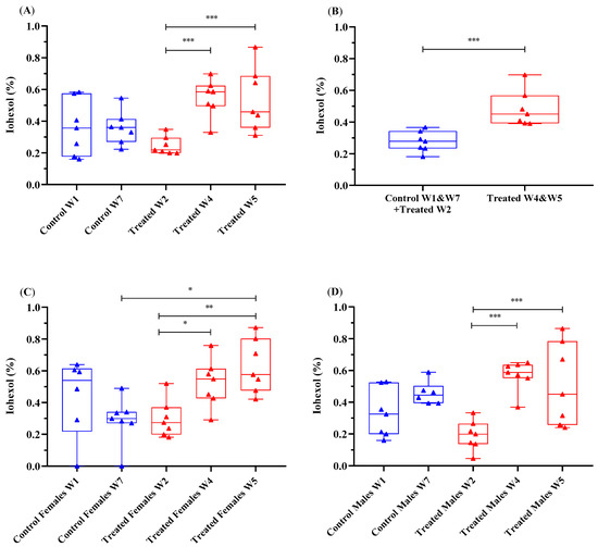 Urinary excretion of iohexol (%) during 24 h following oral administration in all mice (A,B) and (C) female and (D) male mice over 24 h, with data combined for the 7 weeks of intestinal permeability testing. Data are presented on a base-10 log scale (Log10 (1 + x)). The horizontal line in the box is the median (50% percentile), and the upper and lower limits of the box indicate the 75% upper and 25% lower quartiles, respectively. The limits of the upper and lower vertical lines represent the maximum and minimum data results, respectively. Dots represent each of the seven urinary collection time points during the 24 h period. * p < 0.05, ** p < 0.01, *** p < 0.001.