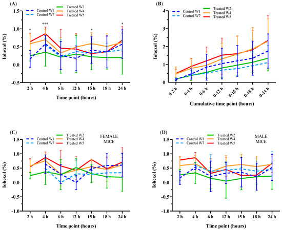 Urinary excretion of iohexol (%) in control and treated (A) female (C) and male (D) mice at seven separate urine collection time points or (B) at seven cumulative time points (after 2, 4, 6, 12, 15, 18 and 24 h) over 24 h after oral administration of iohexol. Data are shown on a base-10 log scale (Log10 (1 + x)) and expressed as means ± SD. * p < 0.05, *** p < 0.001.