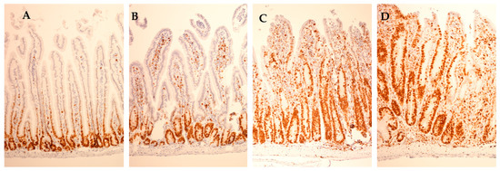Histological duodenitis was assessed, as reported previously [38], also demonstrated in Table S6. Ki–67–stained histological sections representing different duodenitis severity scores are demonstrated in Figure 5. The correlation between the histological score for duodenitis and the weight of the duodenum or the total small intestine is illustrated in Figure 6 and presented in Table S7. A strong correlation coefficient was obtained between the histological score for duodenitis and the duodenum weight in female and male mice together and separately (Spearman’s rho: n = 0.76, p < 0.001, n = 27; 0.60, p = 0.020, n = 15; 0.71, p = 0.004, n = 15, respectively). The correlation between the histological score of duodenitis and the ratio of the duodenum or the total small intestine weight to animal body weight is presented in Table S8. A strong correlation coefficient was obtained between the histological score of duodenitis and the ratio of duodenum weight to animal body weight in female and male mice together and separately (Spearman’s rho: n = 0.73, p < 0.001, n = 27; 0.70, p = 0.005, n = 15; 0.77, p = 0.001, n = 15, respectively). Data on the duodenum weight were obtained from a group of control mice (n = 3) for comparison.