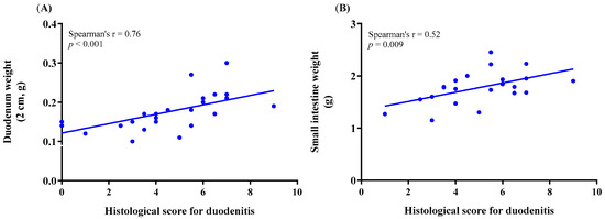 Spearman’s rank correlation coefficient between the histological score for duodenitis and the weight of (A) the duodenum and (B) the total small intestine in treated and control mice combined.