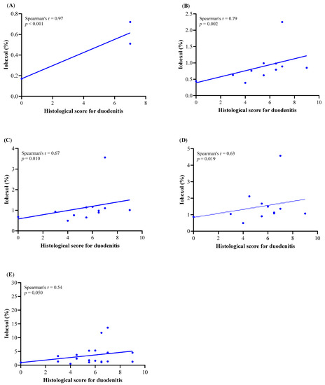 Spearman’s rank correlation coefficient between the histological score for duodenitis and the urinary excretion of iohexol in time periods (A) 0–2 h, (B) 0–4 h, (C) 0–6 h, (D) 0–12 h and (E) 0–15 in treated male mice in Week 5.