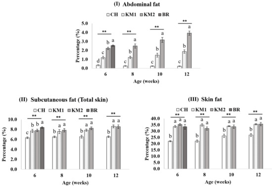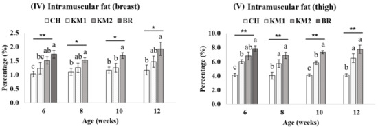 The fat deposition in the abdominal, subcutaneous tissue, skin, P. major, and thigh muscle were investigated in different breeds (Figure 1). The CH breed had the lowest fat deposition (p < 0.05) compared with KM1, KM1, and BR for all the tissues studied. At week 6, the BR breed had a significantly higher fat percentage in all tissues except skin fat compared to the other breeds. From 8 to 12 weeks, the comparison was between CH, KM1, and KM2. The KM2 breed had the highest percentage (p < 0.05) of abdominal fat compared to KM1 and CH). Skin percentage and skin fat in both KM1 and KM2 were not different (p > 0.05). There is a significantly higher intramuscular fat (IMF) of BR in both P. major and B. femoris than KM1 and CH (p < 0.05) but not different with KM2. From 8 to 12 weeks, CH breed was lower IMF than KM2 in both muscle tissues (p < 0.05). While there was no difference in intramuscular fat between KM1 and KM2 chickens.